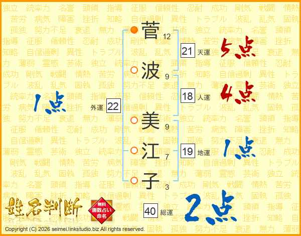菅(12画)波(9画) 美(9画)江(7画)子(3画)