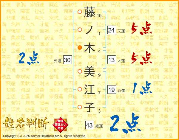 藤(19画)ノ(1画)木(4画) 美(9画)江(7画)子(3画)