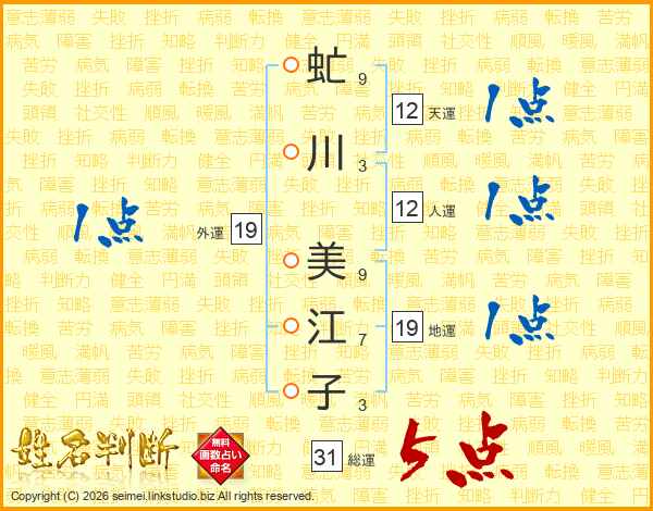 虻(9画)川(3画) 美(9画)江(7画)子(3画)
