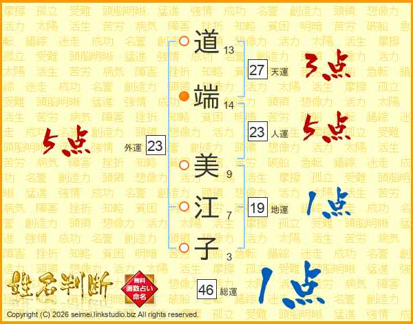 道(13画)端(14画) 美(9画)江(7画)子(3画)