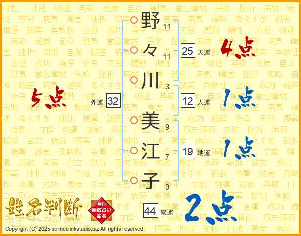 野(11画)々(11画)川(3画) 美(9画)江(7画)子(3画)