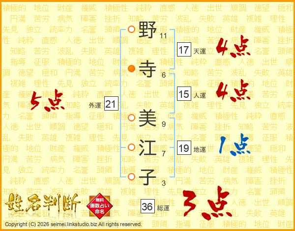 野(11画)寺(6画) 美(9画)江(7画)子(3画)