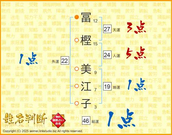 冨(12画)樫(15画) 美(9画)江(7画)子(3画)