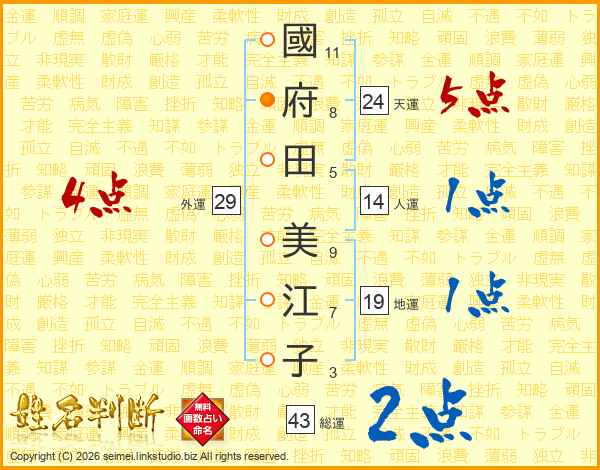 國(11画)府(8画)田(5画) 美(9画)江(7画)子(3画)