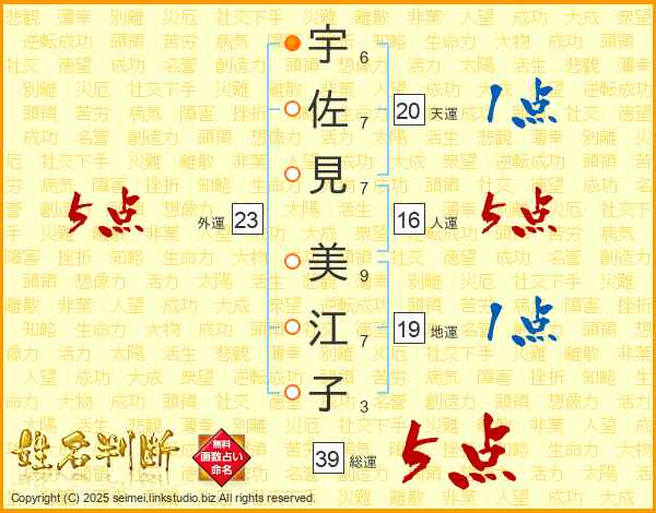 宇佐見美江子さんの総運は39画の5点!