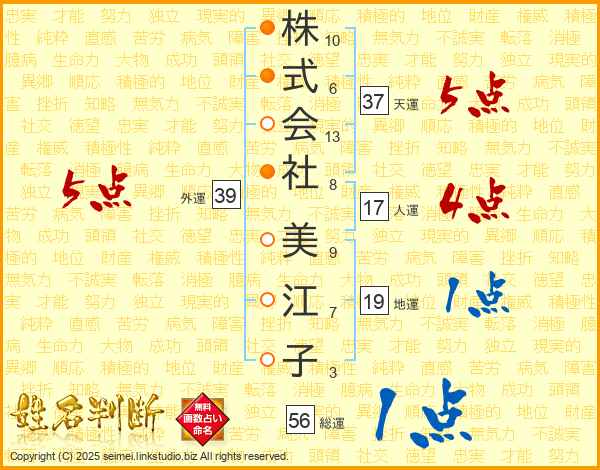株(10画)式(6画)会(13画)社(8画) 美(9画)江(7画)子(3画)
