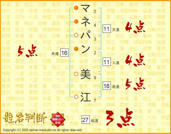 マ(2画)ネ(4画)パ(3画)ン(2画) 美(9画)江(7画)