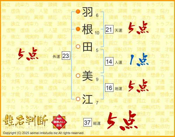 羽(6画)根(10画)田(5画) 美(9画)江(7画)