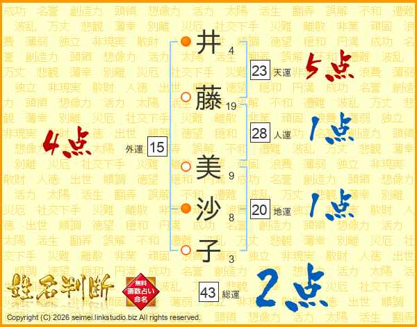 井(4画)藤(19画) 美(9画)沙(8画)子(3画)