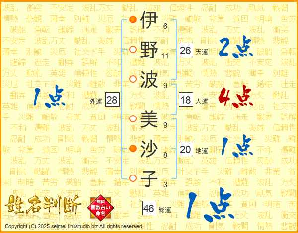 伊(6画)野(11画)波(9画) 美(9画)沙(8画)子(3画)