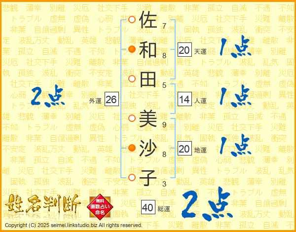 佐(7画)和(8画)田(5画) 美(9画)沙(8画)子(3画)