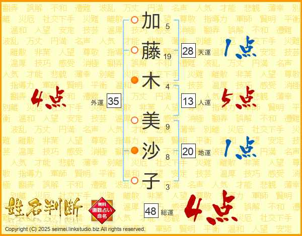 加(5画)藤(19画)木(4画)  美(9画)沙(8画)子(3画)