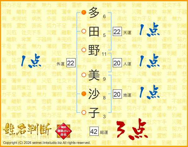 多(6画)田(5画)野(11画) 美(9画)沙(8画)子(3画)