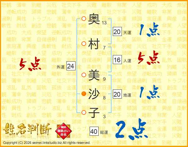 奥(13画)村(7画) 美(9画)沙(8画)子(3画)