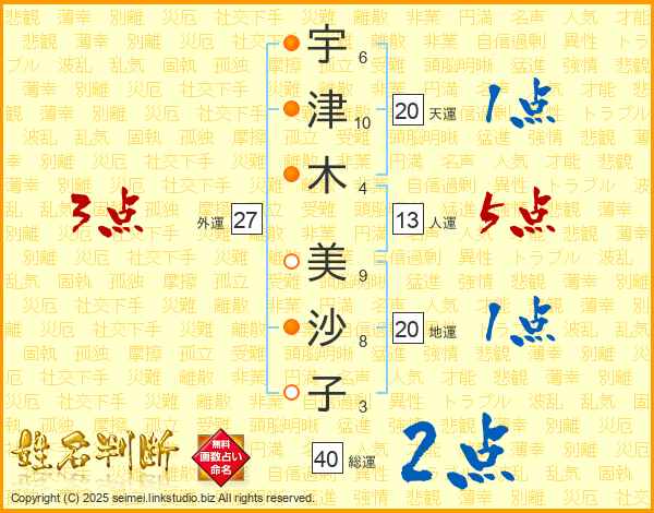 宇(6画)津(10画)木(4画) 美(9画)沙(8画)子(3画)