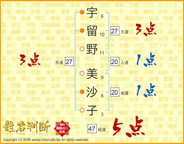 宇(6画)留(10画)野(11画) 美(9画)沙(8画)子(3画)