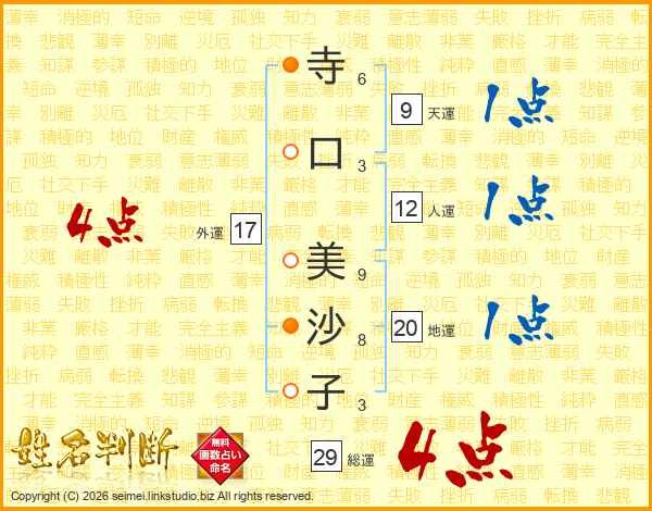寺(6画)口(3画) 美(9画)沙(8画)子(3画)
