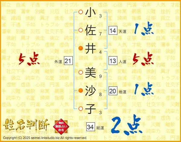 小(3画)佐(7画)井(4画) 美(9画)沙(8画)子(3画)