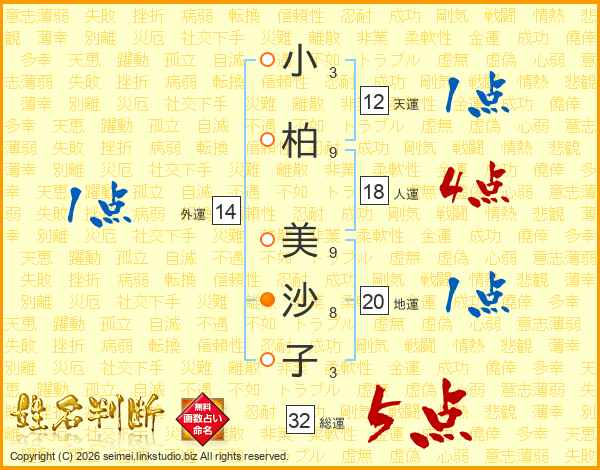 小(3画)柏(9画) 美(9画)沙(8画)子(3画)