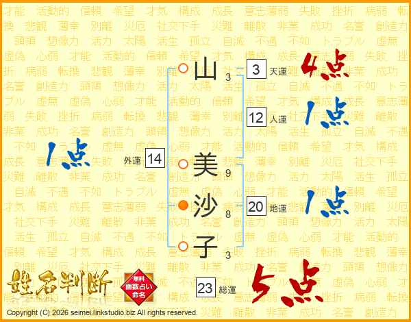 山美沙子さんの総運は23画の5点!