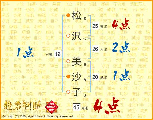松(8画)沢(17画) 美(9画)沙(8画)子(3画)
