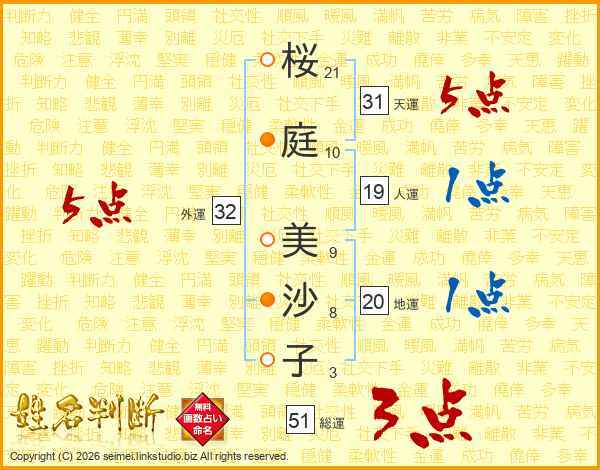 桜(21画)庭(10画) 美(9画)沙(8画)子(3画)