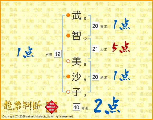 武(8画)智(12画) 美(9画)沙(8画)子(3画)