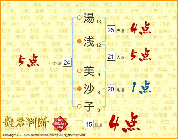 湯(13画)浅(12画) 美(9画)沙(8画)子(3画)