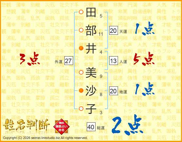 田(5画)部(11画)井(4画) 美(9画)沙(8画)子(3画)
