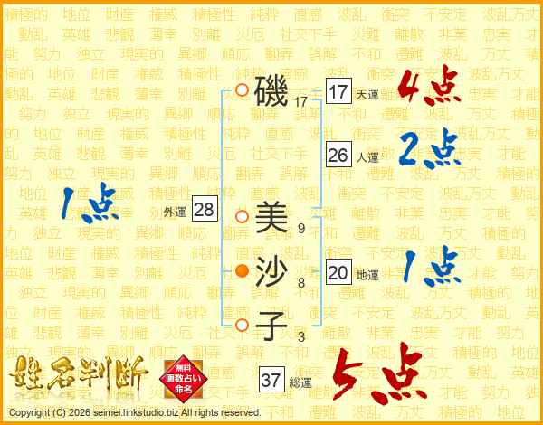 磯(17画) 美(9画)沙(8画)子(3画)