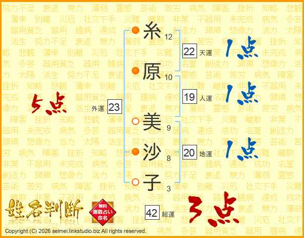糸(12画)原(10画) 美(9画)沙(8画)子(3画)
