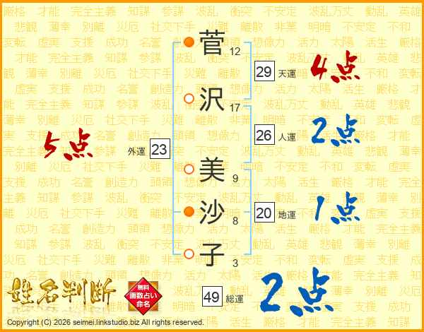 菅(12画)沢(17画) 美(9画)沙(8画)子(3画)