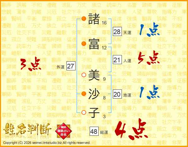 諸(16画)富(12画) 美(9画)沙(8画)子(3画)
