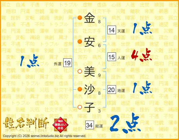 金(8画)安(6画) 美(9画)沙(8画)子(3画)