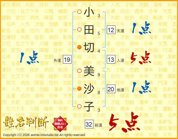 小(3画)田(5画)切(4画) 美(9画)沙(8画)子(3画)