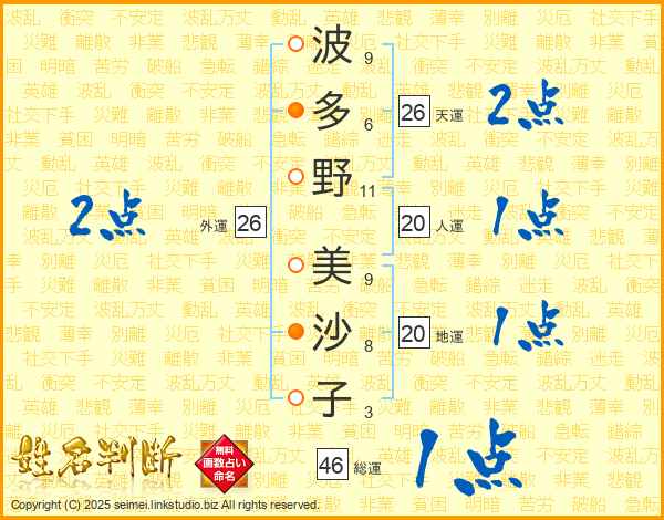 波(9画)多(6画)野(11画) 美(9画)沙(8画)子(3画)