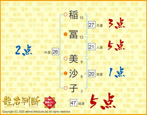 稲(15画)冨(12画) 美(9画)沙(8画)子(3画)