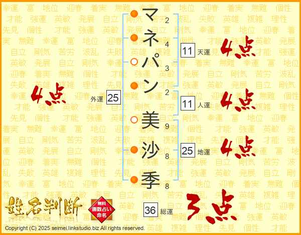 マ(2画)ネ(4画)パ(3画)ン(2画) 美(9画)沙(8画)季(8画)