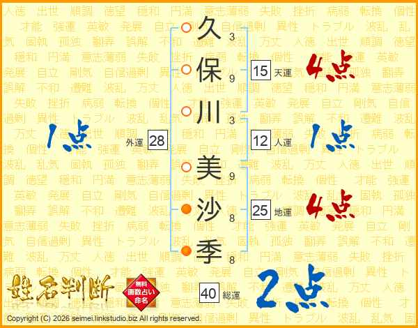 久(3画)保(9画)川(3画) 美(9画)沙(8画)季(8画)