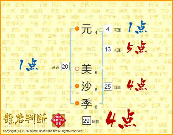 生活面を象徴する運勢です。外部から受ける影響力を表し、結婚運、家庭運や職場、環境への順応性を表します。総運から人運を引いた画数。姓や名が1文字の場合を除く。