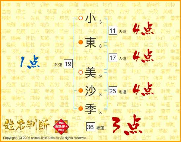 小(3画)東(8画) 美(9画)沙(8画)季(8画)