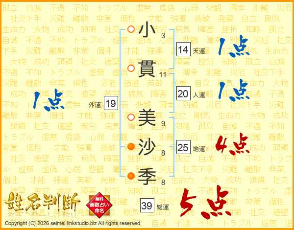 小(3画)貫(11画) 美(9画)沙(8画)季(8画)