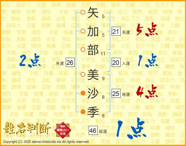 矢(5画)加(5画)部(11画) 美(9画)沙(8画)季(8画)