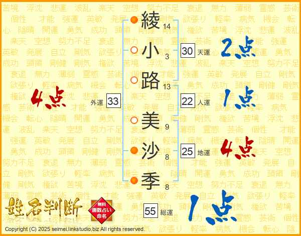 綾(14画)小(3画)路(13画) 美(9画)沙(8画)季(8画)