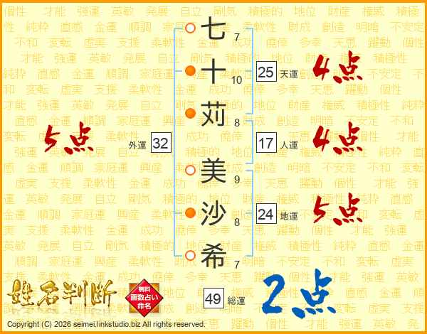 七(7画)十(10画)苅(8画) 美(9画)沙(8画)希(7画)