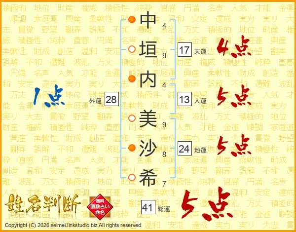 中(4画)垣(9画)内(4画) 美(9画)沙(8画)希(7画)