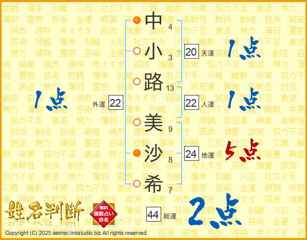 中(4画)小(3画)路(13画) 美(9画)沙(8画)希(7画)