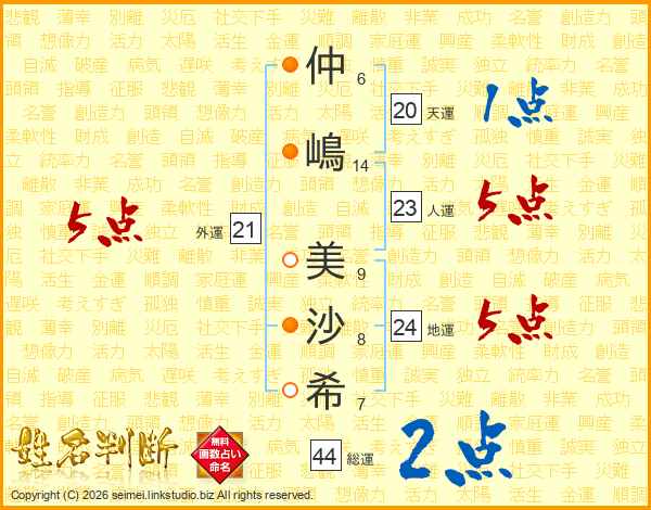 仲(6画)嶋(14画) 美(9画)沙(8画)希(7画)