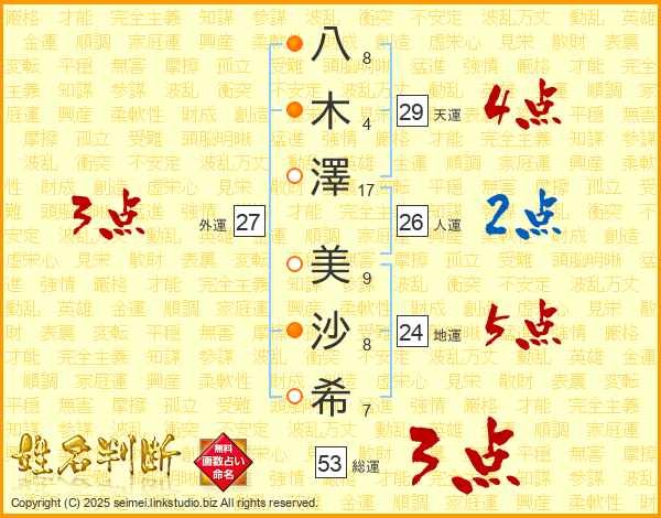 八(8画)木(4画)澤(17画) 美(9画)沙(8画)希(7画)