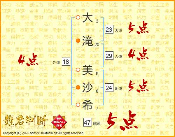 大(3画)滝(20画) 美(9画)沙(8画)希(7画)